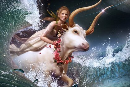 一个女孩在水中骑公牛