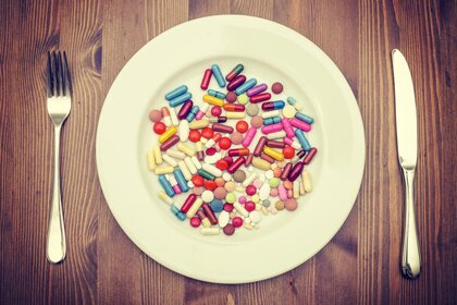 健康的生活方式彩色药丸上的板叉刀