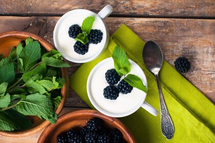 黑莓浆果和薄荷叶在杯子