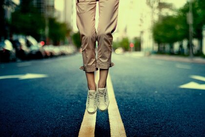 世界城市的街道。 重力中的女孩