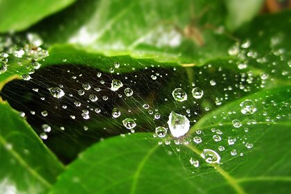 很多露珠落在树叶上